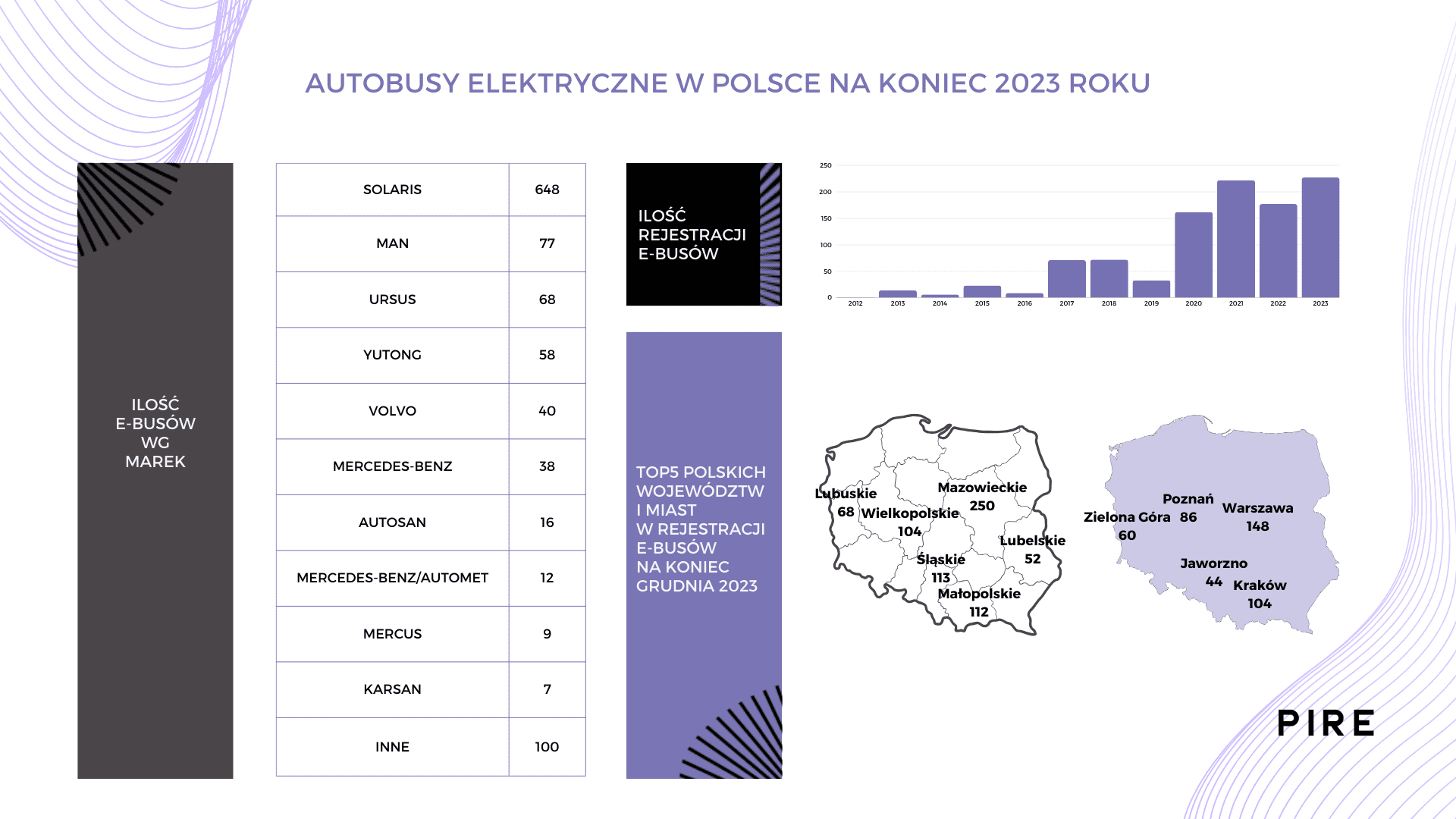 Na polskich drogach zauważyć można autobusy 26 różnych producentów. Wiodącym pośród nich jest Solaris. W 2023 roku zostało zarejestrowanych 648 e-busów Solaris. Po Solarisie, inne marki również zaznaczają swoją obecność: