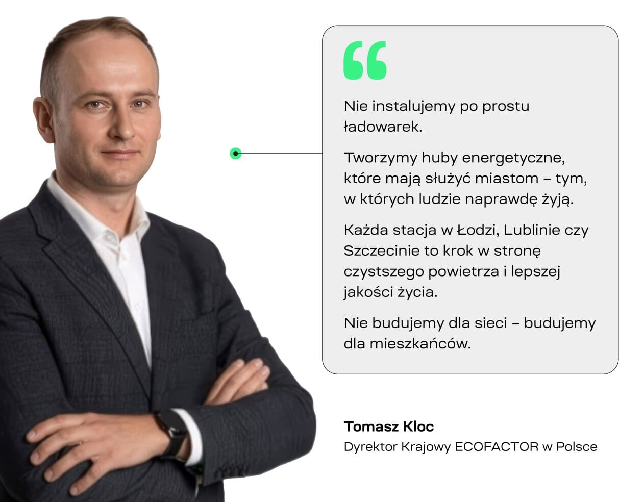 Finalnie bowiem transformacja energetyczna nie dzieje się na autostradzie. Dzieje się na osiedlowym parkingu, przy bloku, przed galerią handlową. W codziennych dojazdach do pracy, w kurierskiej furgonetce, w miejskim autobusie. To właśnie w tych miejscach – zwykłych, codziennych, polskich – ECOFACTOR buduje swoją sieć. I to właśnie tam ma ona największy sens.