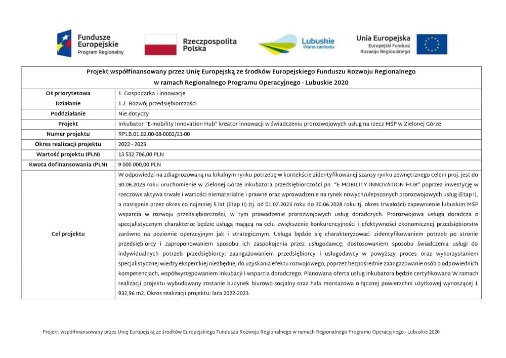 Dzisiaj, w Urzędzie Marszałkowskim Województwa Lubuskiego, Prezes PIRE Krzysztof Burda podpisał umowę na dofinansowanie projektu budowy Inkubatora technologicznego – E-Mobility Innovation HUB.