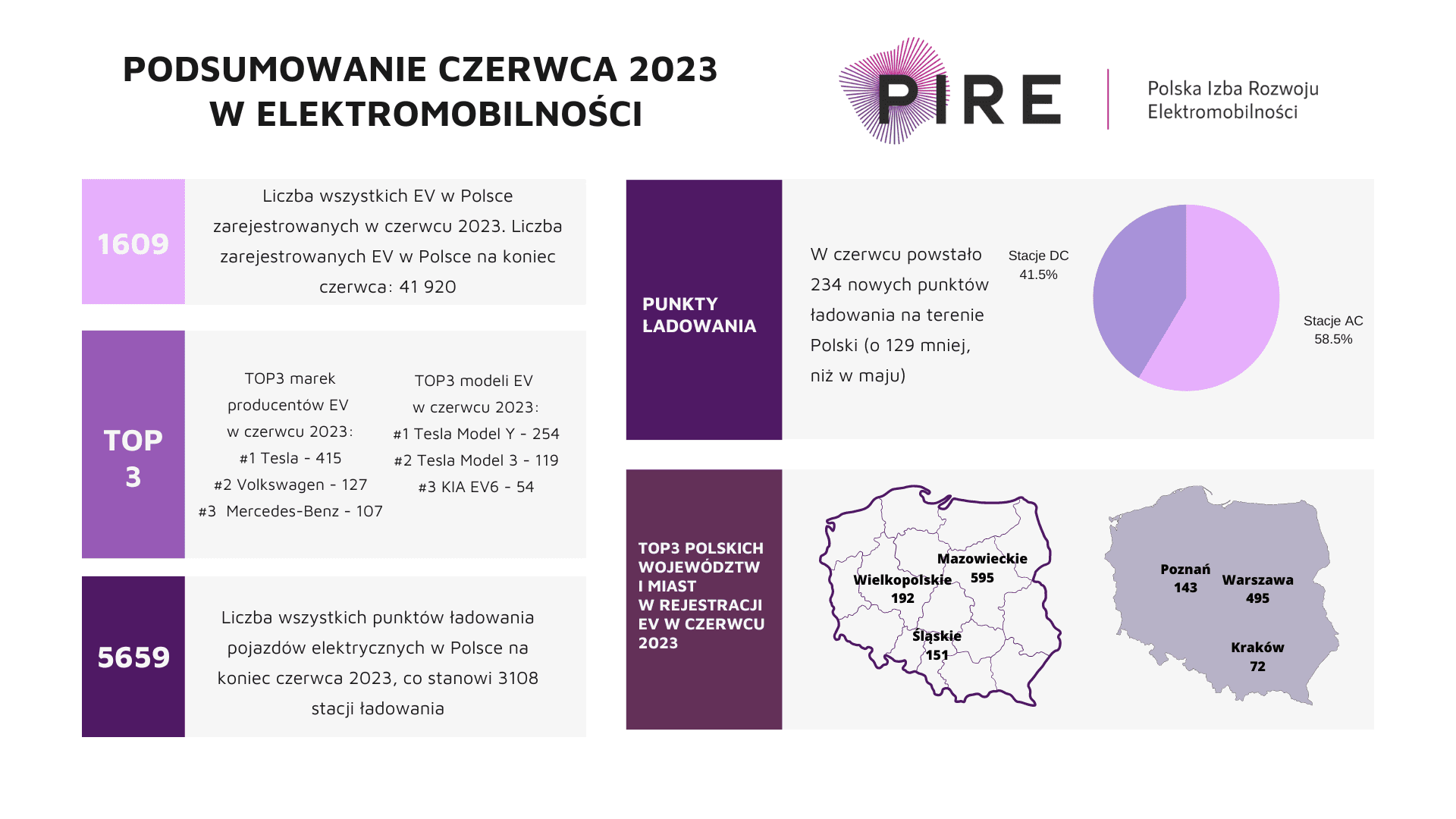 Nieustannie przybywa również infrastruktury ładowania. W czerwcu zarejestrowano 234 nowe punkty ładowania, co daje wartość 5659 punktów ładowania ogółem. W czerwcu powstało 137 punktów ładowania AC oraz 97 punktów DC.