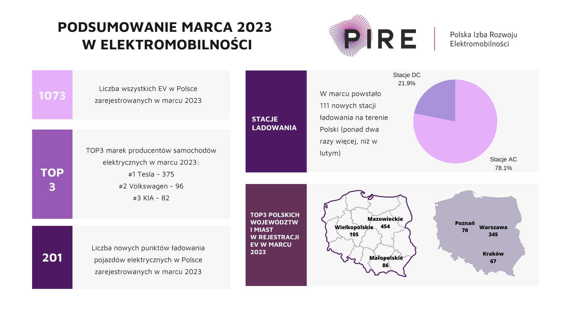 Najpopularniejsze rejestrowane marki w marcu 2023 to Tesla, Volkswagen i Kia. Najwięcej samochodów elektrycznych zarejestrowano w Warszawie – 345 sztuki, Poznaniu (70) i Krakowie (67).